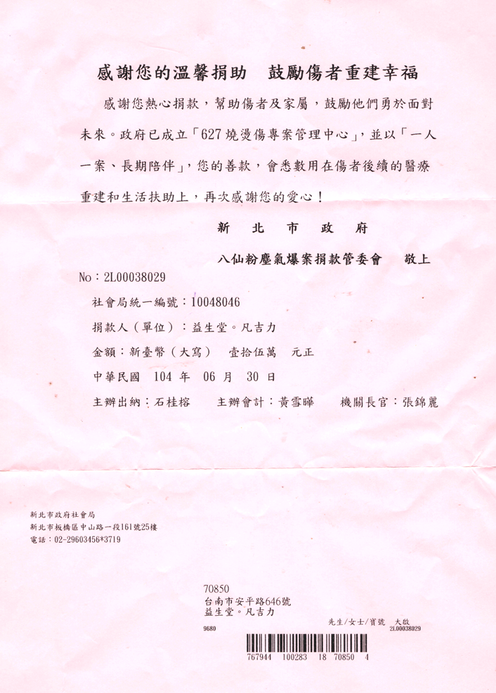 Dear 益生堂。凡吉力朋友您好:
