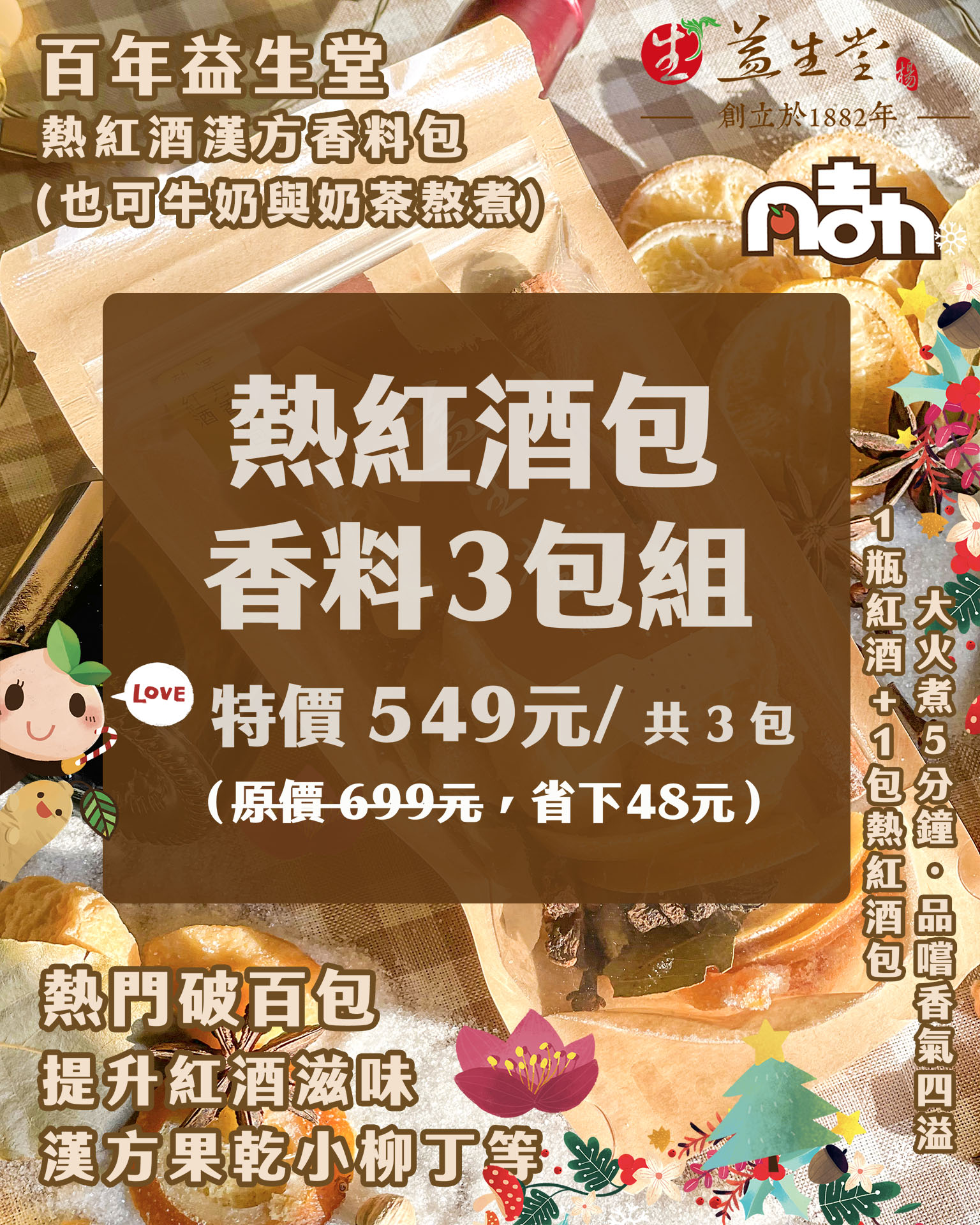 【聖誕優惠 3 包組】益生堂熱紅酒香料包【含漢方香料包 + 漢方果乾小柳丁等】(原價699元) 549元/ 3包組 (單包優惠183元 | 省下超多48元)【也可煮牛奶、奶茶】
