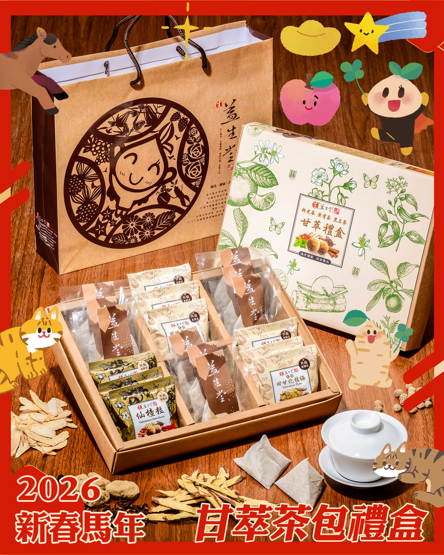 【益生堂。凡吉力】益生堂甘萃茶包禮盒 (隨身18小包裝)~ 2026HOT破千盒!經典回甘雋永,粉光蔘黃耆茶黑豆茶 & 熱門仙楂粒隨身各x3小包、究極回甘化核梅隨身x6小包,送禮心意【含禮袋款】
