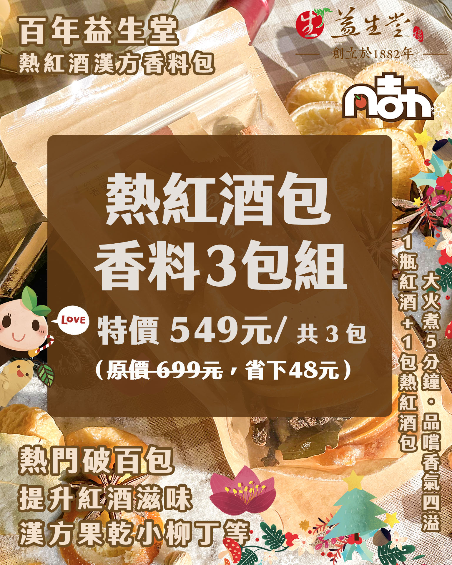 【聖誕優惠3包組】益生堂熱紅酒香料包【含漢方香料包 + 漢方果乾小柳丁等】(原價699元) 549元/ 3包組 (單包優惠183元 | 省下超多48元)
