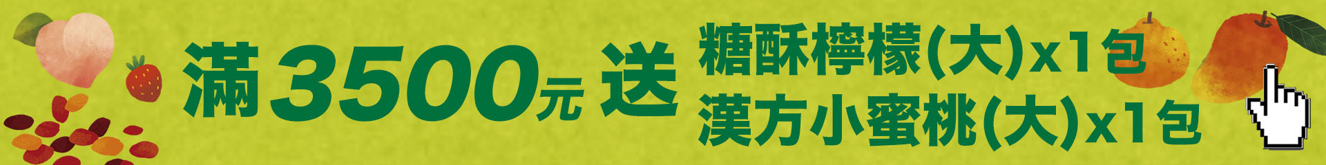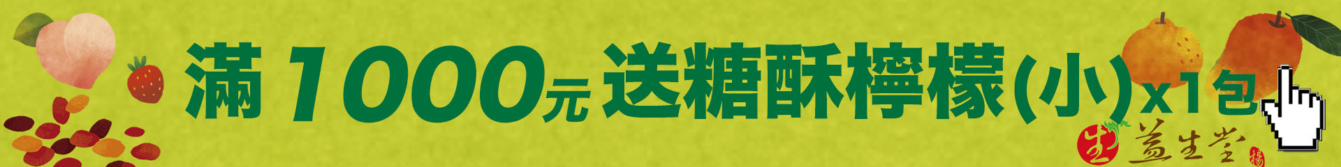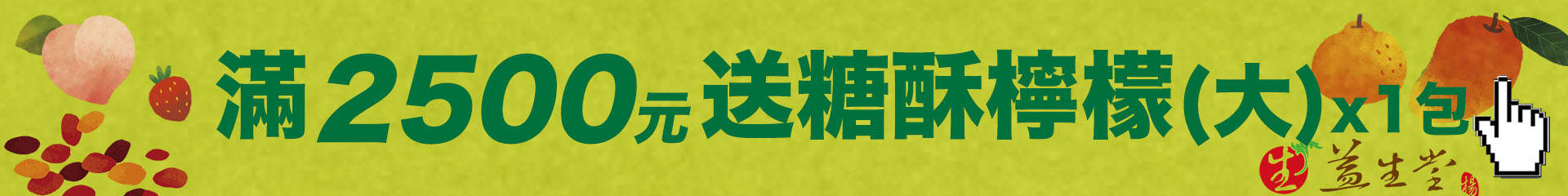 ❤️【2026 漢方水果蜜餞 · 春】❤️【A】滿 1000元送糖酥檸檬(小) x1【B】滿 2500元送糖酥檸檬(大) x1【C】滿 3500元送糖酥檸檬(大) x1 + 漢方小蜜桃(大) x1【臺灣常溫宅配滿 990 免運費 · 超商取貨滿 890 免運費】❤️🎉 歡迎官網線上訂購、來電訂購 06 - 2209336 傳真訂購 06 - 2246658 或 Ystangfunjili@gmail.com 🎉🎉🎉