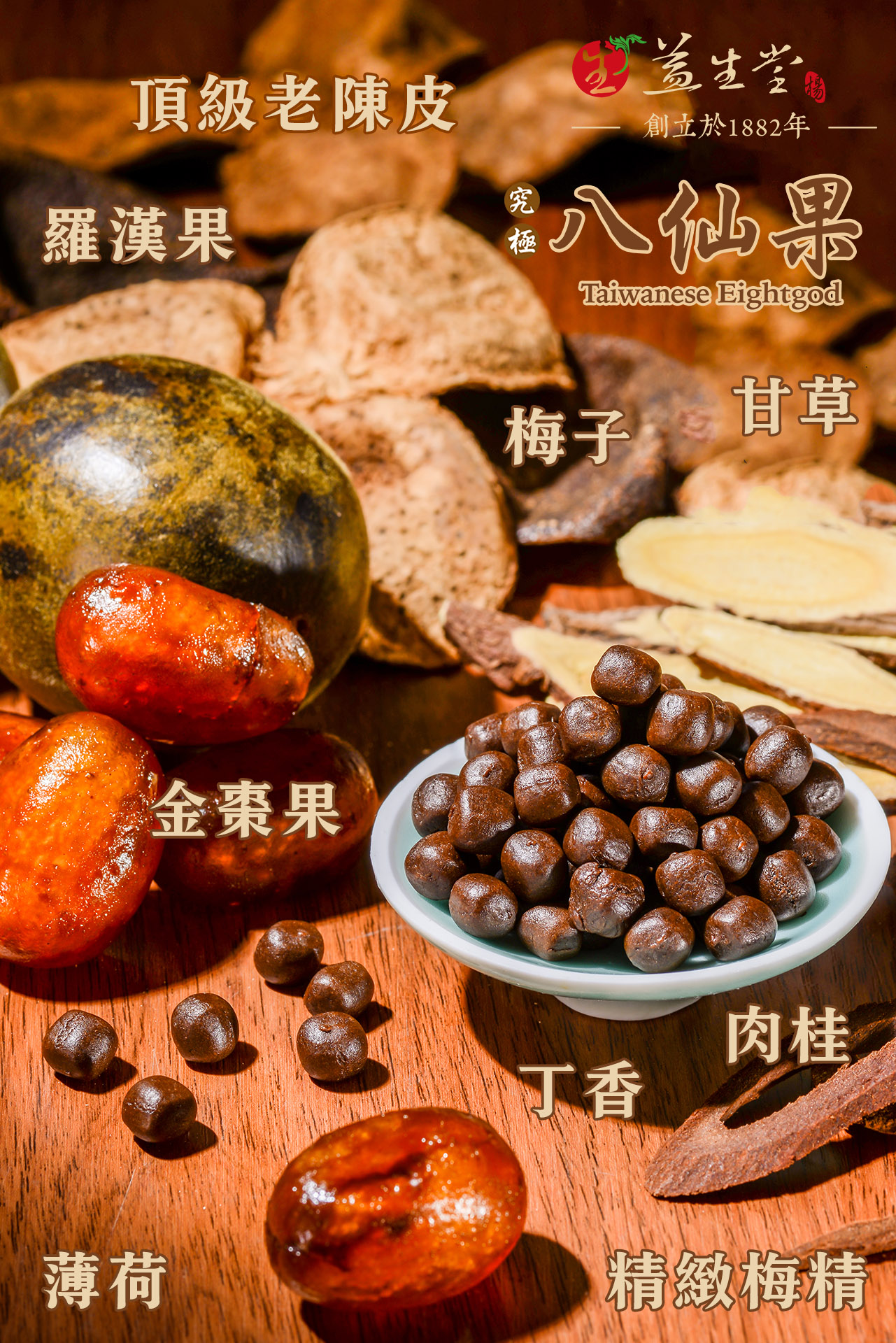 中藥材系列、藥膳食補系列、漢方飲品系列、古早味益生堂仙楂粒、薄荷宋陳丸系列、漢方水果蜜餞系列、漢方沖泡茶飲系列、益生堂楊家獨門藥膳香腸、漢方梅子粉