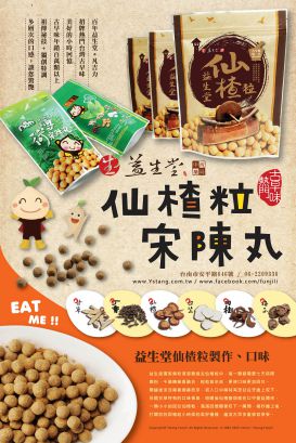『古早味益生堂仙楂粒』,流傳了七十年的好味道是老一輩台灣人小時後懷舊的記憶,台語俗稱「宋陳丸」,最早由 益生堂第二代 楊大笨醫師研發,是提供給客人藥材包回家煎煮中藥,會煮出一碗深褐色藥湯 ~~~~(苦苦苦)